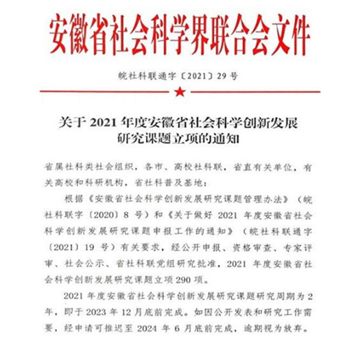 近日,安徽省社会科学界联合会发布了《关于2021年度安徽省社会科学创新发展研究课题立项的通知》(皖社科联通字〔2021〕29号),公布了安徽省社会科学创新发展研究课题项目立项名单。我校成功获批项目6项。