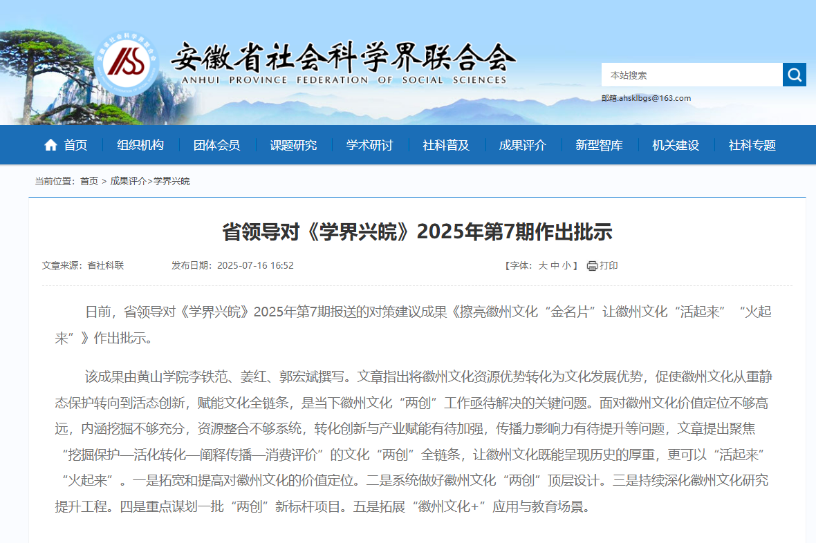 在政策建言领域,智库打通“市-省-国家”多层级转化渠道。旅游学院张俊香撰写的《黄山市数字创意产业发展白皮书》获市政府主要领导批示,被转相关部门研究落实,近两年来其4份资政报告先后得到市领导肯定;教育科学学院于丰园的《黄山市特色新型智库建设的对策研究》获黄山市领导批示,结合国家社科基金项目提出制度创新、人才培养创新等路径建议;省级层面,朱红兵、金声琅、李瑛等教师的《新质生产力视域下大黄山旅游人才高质量培养路径》《多元创新精准布局推动大黄山文旅演艺产业高质量发展》《“苏超”破圈对安徽文旅融合发展的启示》等研究被《安徽省情》刊载;李铁范、姜红、郭宏斌撰写的《擦亮徽州文化“金名片”让徽州文化“活起来”“火起来”》获省领导批示,为全省徽州文化保护传承提供参考;国家层面,学校与安徽大学舆情与区域形象研究中心(中宣部直报点)合作,多篇深度咨政报告被中央有关部门采用,姜红参与撰写的《“新一轮民营经济的春天来了”——舆论场热议习近平总书记出席民营企业家座谈会并发表重要讲话》,舆情写作小组刘罗玉、郭宏斌等撰写的《谷爱凌天价训练经费引舆情关注》《2025“两会”媒体报道与传播综述》,为中央决策提供重要支撑。此外,郭宏斌还参与中宣部中央马工程重点课题《习近平文化思想的安徽实践研究》,负责案例报告《打牢社会治理的文化根基——中华优秀传统文化赋能基层治理的安徽实践》撰写工作,成果已报送中宣部理论局。