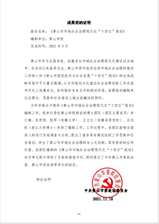 黄山市市域社会治理现代化研究中心则聚焦社会治理创新与平安建设,为地方治理提供专业支撑。中心牵头编制的《黄山市市域社会治理现代化“十四五”规划》,成为黄山市作为全国首批、安徽首位市域社会治理现代化试点城市的重要指导文件;制定的《社区矫正社会工作服务规范》(DB3410/T31-2023),填补了黄山市社区矫正服务标准空白,帮助黄山市社区矫正工作始终领跑全省。郭宏斌团队在此领域成果丰硕,不仅在《社区心理学研究》《中国社会工作》等核心期刊发表多篇论文,主持安徽省高校人文社科重点项目及安徽省法学会调研课题,研发的《“更生护航”社区矫正对象自陈量表》心理评估模型被引入全省社区矫正智能管理平台,成为全省通用模版。“屯安红袖”志愿服务项目还荣获屯溪区第三届新时代文明实践志愿服务项目优秀奖,该项目通过建立公益活动项目库、组建志愿服务队伍,有效推动社区矫正劳动教育创新与基层社会治理融合。