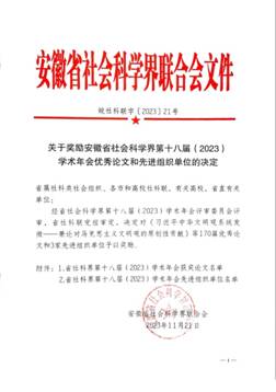 本届年会的主题是“谱写中国式现代化的安徽篇章”,共收到论文699篇,经年会学术委员会评选出一、二、三等奖及优秀奖,共计170篇获奖论文。我校教师为第一作者的论文获二等奖1项,三等奖1项,优秀奖1项。