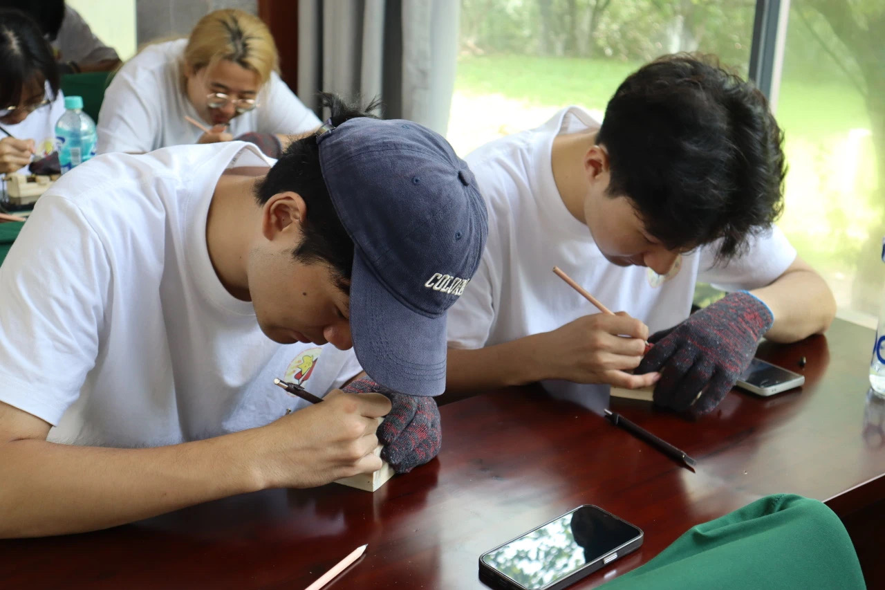 在安徽中国徽州文化博物馆,第九期“行知课堂”学员、文学院汉语言文学专业学生解光磊认真聆听安徽省非物质文化遗产代表性传承人周小勇有关徽州篆刻制作技艺的讲解。随后,他拿起篆刻工具,小心翼翼地刻出了以“黄山”为印文内容的篆刻作品,感受了一场博物馆里的思政课。