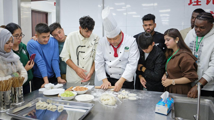 27日上午,留学生们来到我校烹饪实验实训中心体验徽菜制作。我校徽菜烹饪名师通过现场示范讲解了徽菜的特点及烹调方法,并指导他们亲手制作徽州特色美食——徽州包袱饺。在烹饪老师的耐心指导下,他们逐渐掌握了和面、搓条、擀皮、包馅、捏饺子的技法和要领,还开心地吃上了自己动手制作的包袱饺。