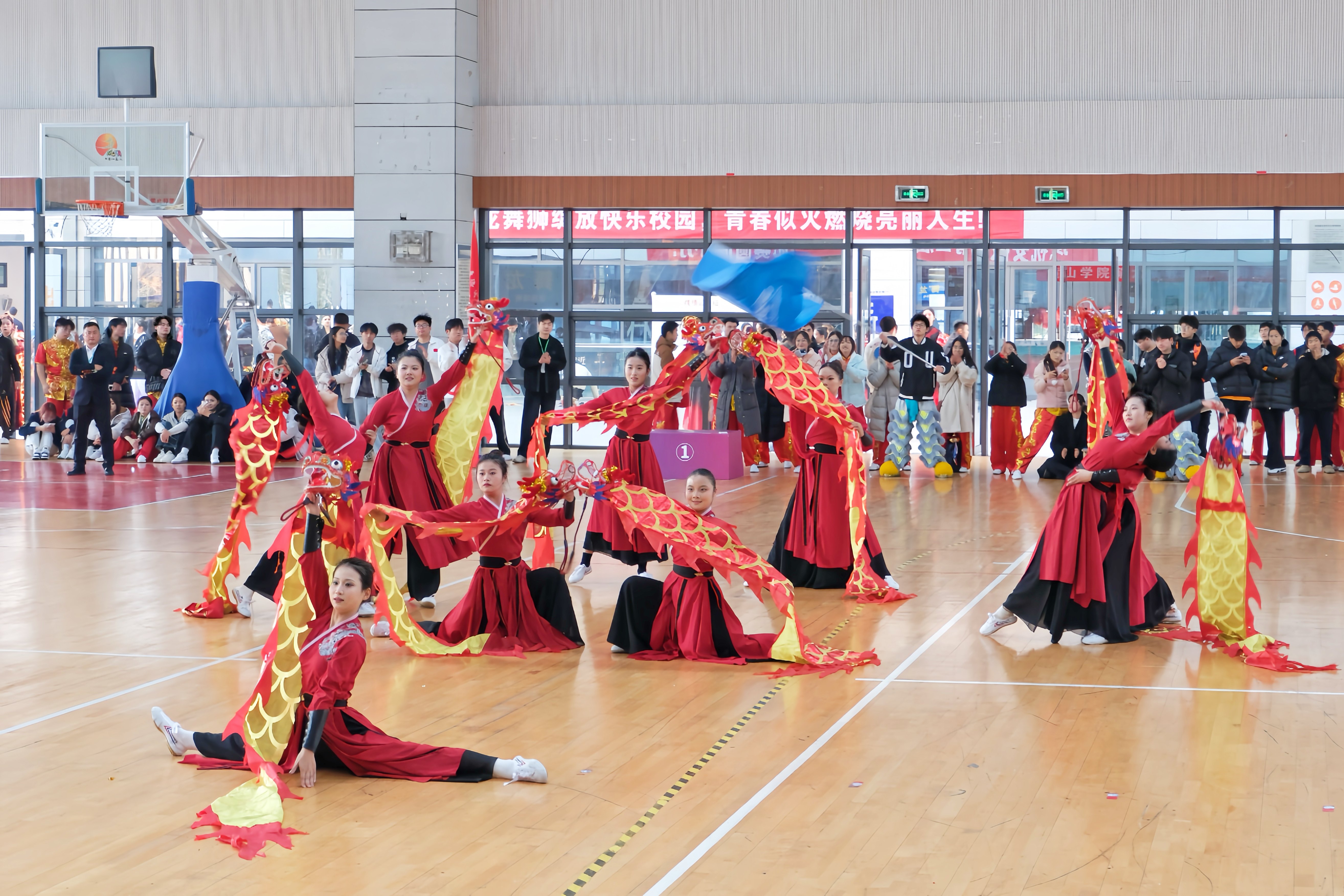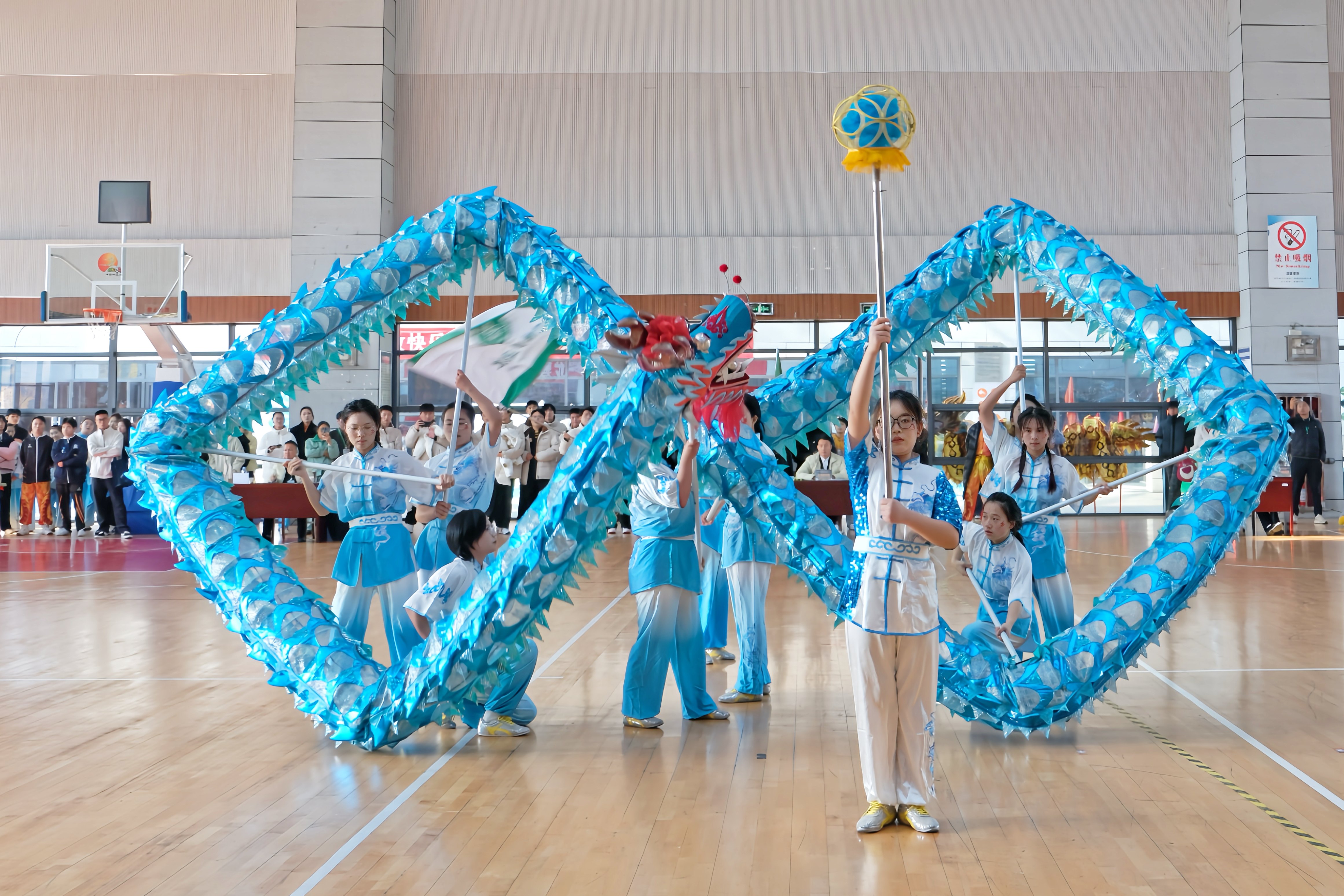 此次比赛共设甲、乙、丙三个组,设置了舞龙规定套路、舞龙自选套路、竞速舞龙、创意龙狮、传统南狮及彩带龙自选套路6个大项。来自全省27所高校的506名运动员参赛。